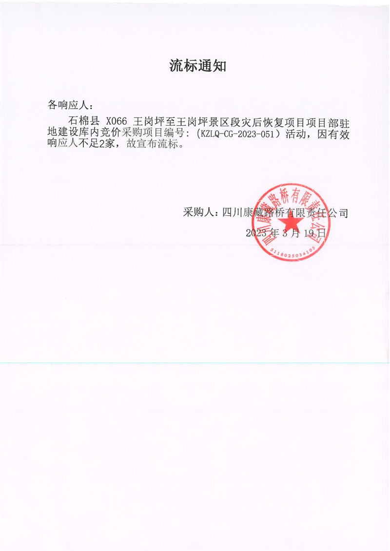 四川康藏路橋有限責任公司石棉縣X066王崗坪至王崗坪景區(qū)段災后恢復項目項目部駐地建設庫內競價采購流標通知