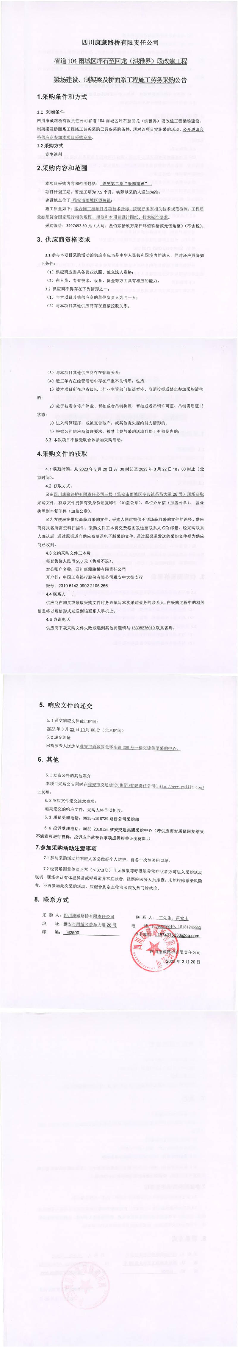 四川康藏路橋有限責任公司省道104雨城區(qū)坪石至回龍(洪雅界)段改建工程梁場建設(shè)、制架梁及橋面系工程施工勞務采購公告