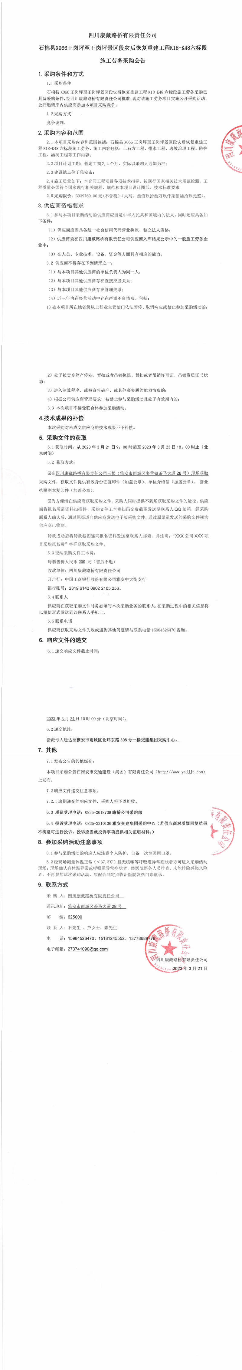 四川康藏路橋有限責任公司石棉縣X066王崗坪至王崗坪景區(qū)段災后恢復重建工程K18-K48六標段施工勞務采購公告