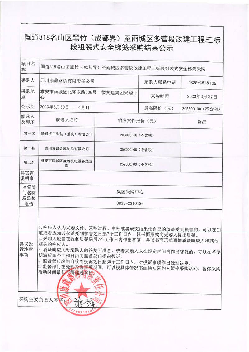 四川康藏路橋有限責任公司國道318名山區(qū)黑竹(成都界)至雨城區(qū)多營段改建工程三標段組裝式安全梯籠采購結果公示