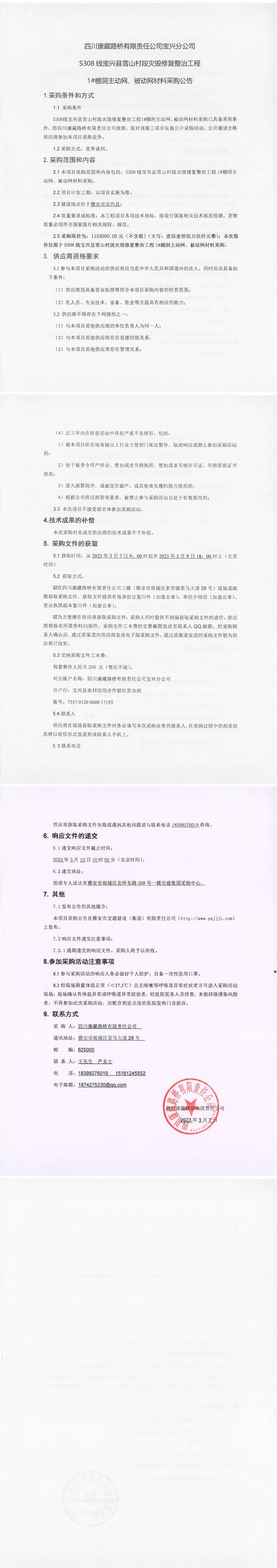 四川康藏路橋有限責(zé)任公司寶興分公司S308線寶興縣雪山村段災(zāi)毀修復(fù)整治工程1#棚洞主動(dòng)網(wǎng)、被動(dòng)網(wǎng)材料采購公告