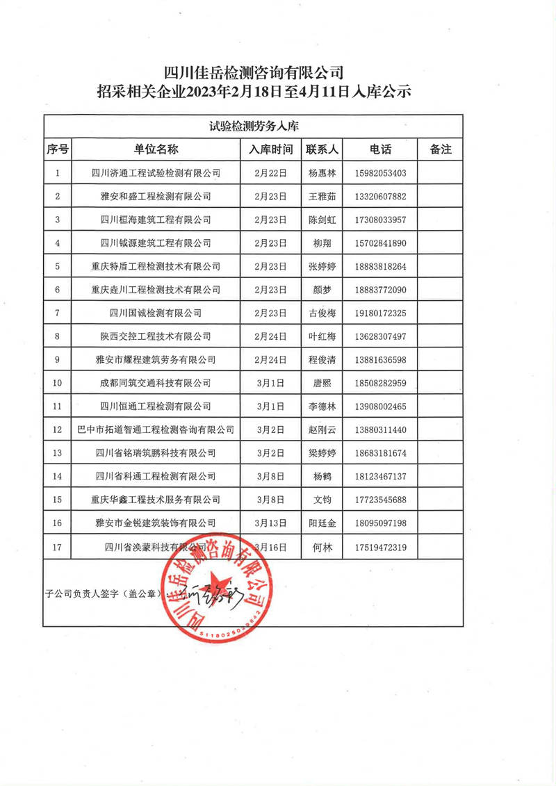 四川佳岳檢測咨詢有限公司(試驗檢測勞務供應商庫)2023年2月18日至4月11日入庫結(jié)果公示