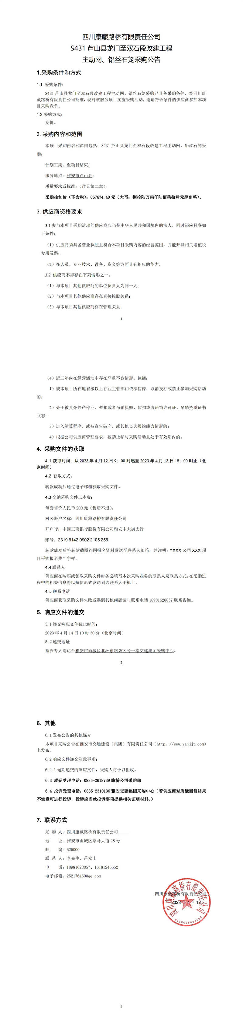四川康藏路橋有限責(zé)任公司S431蘆山縣龍門至雙石段改建工程主動網(wǎng)、鉛絲籠采購公告