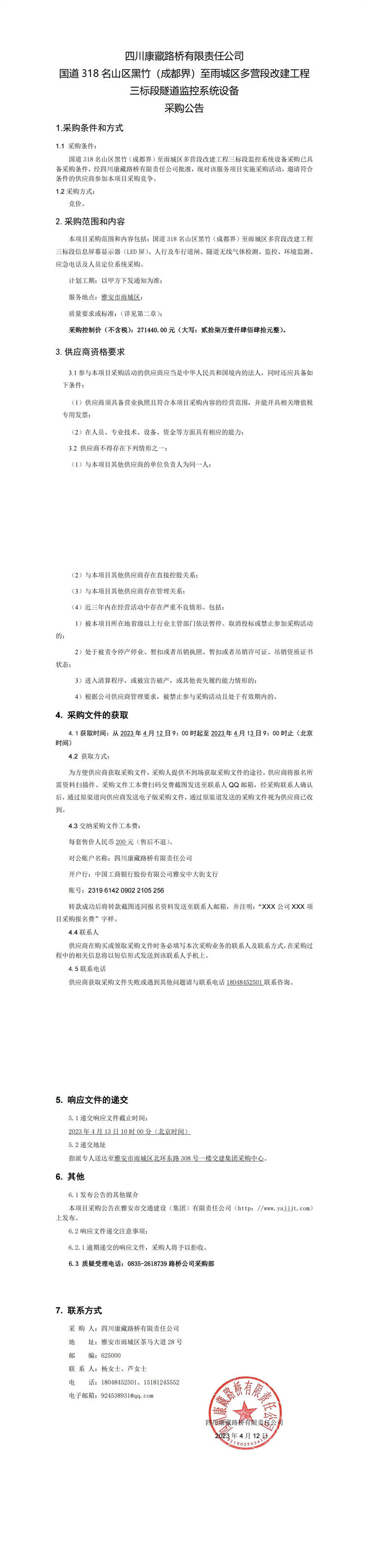 四川康藏路橋有限責任公司國道318名山區(qū)黑竹(成都界)至雨城區(qū)多營段改建工程三標段隧道監(jiān)控系統(tǒng)設(shè)備采購公告