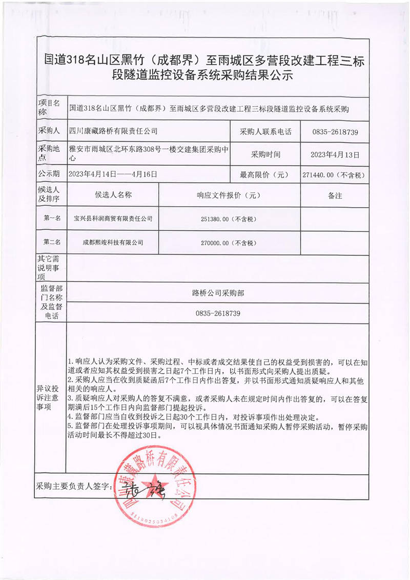 四川康藏路橋有限責(zé)任公司國(guó)道318名山區(qū)黑竹(成都界)至雨城區(qū)多營(yíng)段改建工程三標(biāo)段隧道監(jiān)控設(shè)備系統(tǒng)采購結(jié)果公示