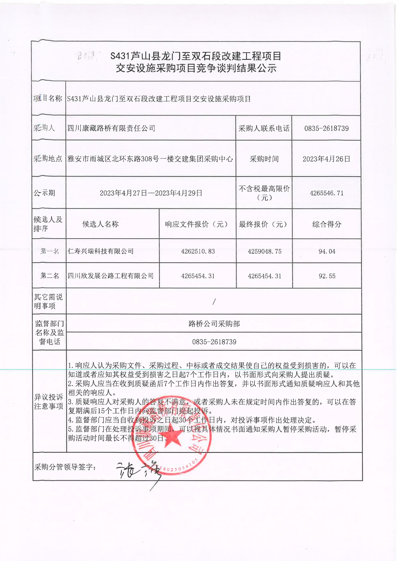 四川康藏路橋有限責任公司S431蘆山縣龍門至雙石段改建工程項目交安設施采購項目競爭談判結果公示