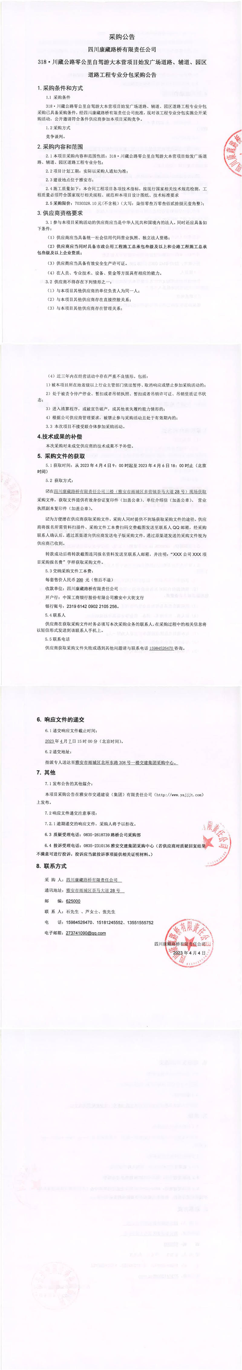 四川康藏路橋有限責(zé)任公司318·川藏公路零公里自駕游大本營(yíng)項(xiàng)目始發(fā)廣場(chǎng)道路、輔道、園區(qū)道路工程專業(yè)分包采購(gòu)公告