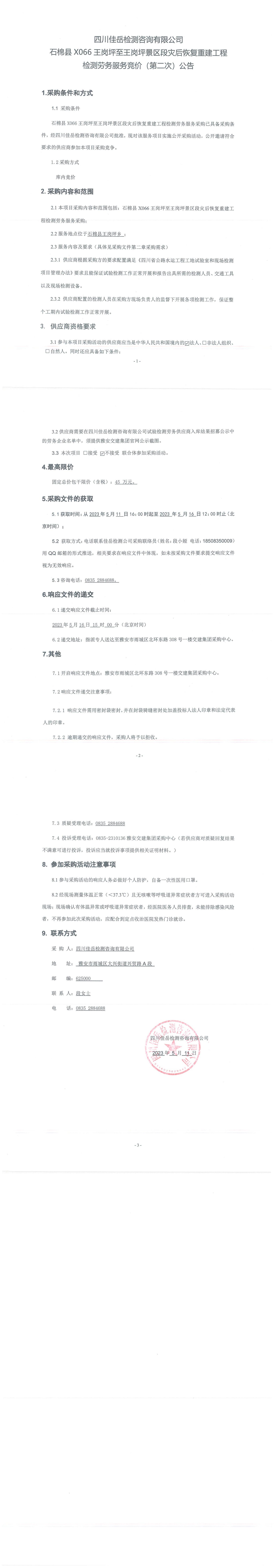 四川佳岳檢測(cè)咨詢(xún)有限公司石棉縣X066王崗坪至王崗坪景區(qū)段災(zāi)后恢復(fù)重建工程檢測(cè)勞務(wù)服務(wù)競(jìng)價(jià)(第二次)采購(gòu)公告