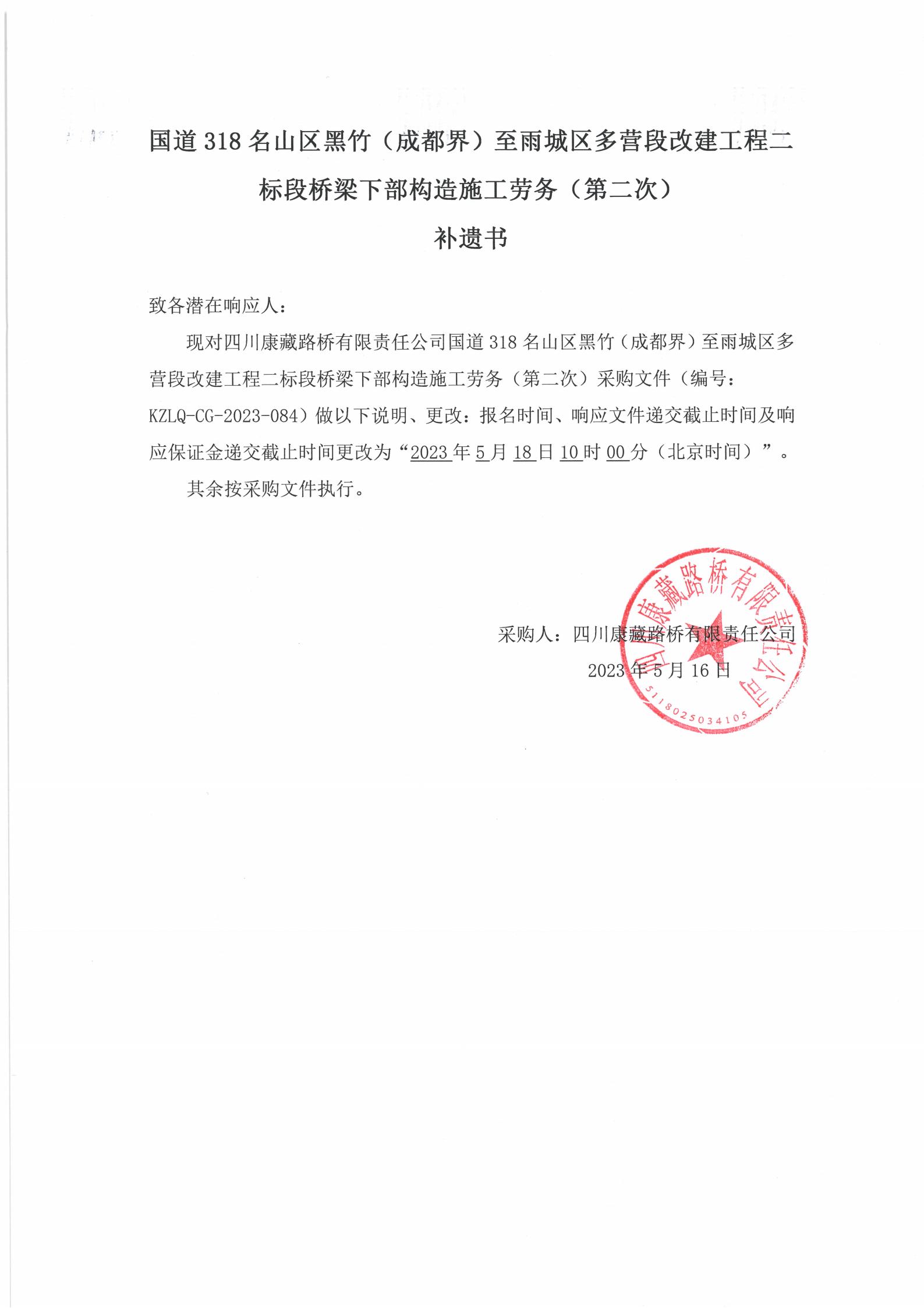四川康藏路橋有限責任公司國道318名山區(qū)黑竹(成都界)至雨城區(qū)多營段改建工程二標段橋梁下部構造施工勞務(第二次)補遺書