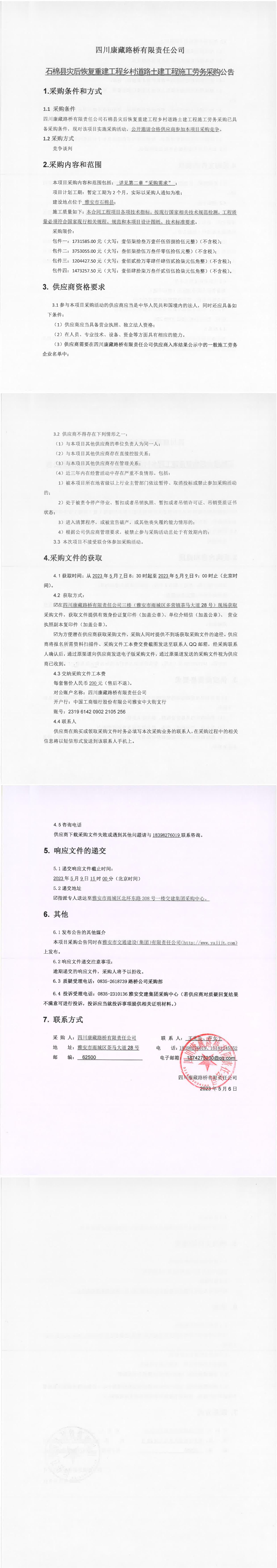 四川康藏路橋有限責任公司石棉縣災后恢復重建工程鄉(xiāng)村道路土建工程施工勞務采購公告
