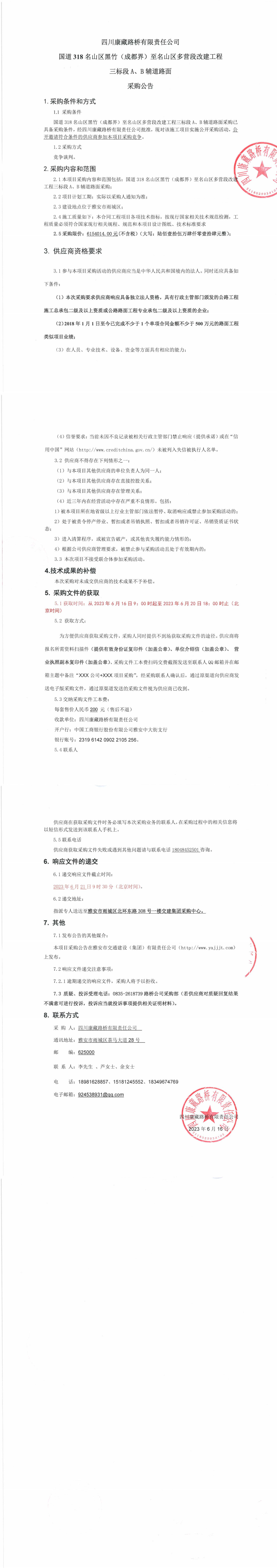 四川康藏路橋有限責(zé)任公司國道318名山區(qū)黑竹(成都界)至名山區(qū)多營段改建工程三標(biāo)段A,B輔道路面采購公告