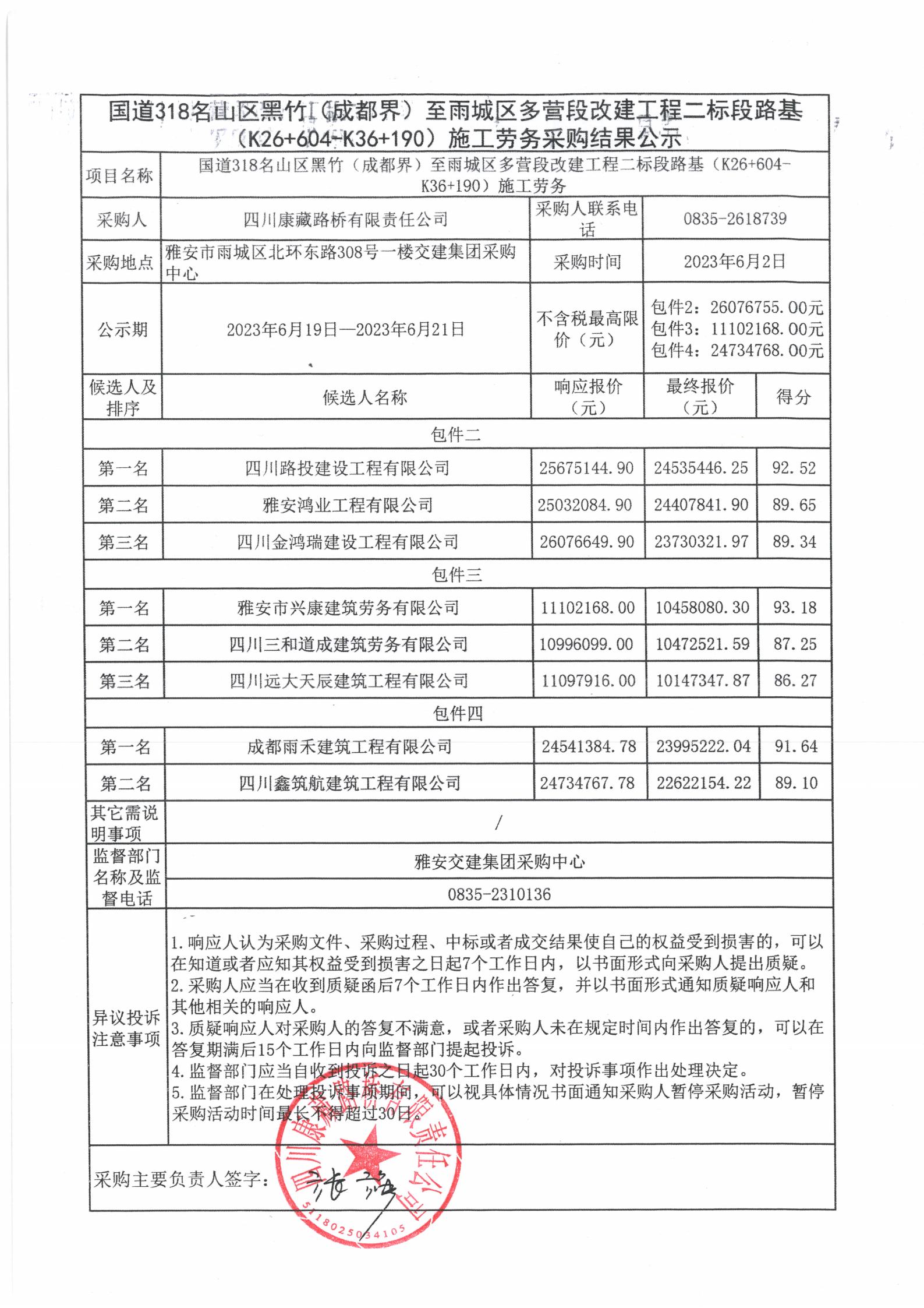 四川康藏路橋有限責(zé)任公司國道318名山區(qū)黑竹(成都界)至雨城區(qū)多營段改建工程二標段路基(K26+604-K36+190)施工勞務(wù)采購(包件二、包件三、包件四)結(jié)果公示