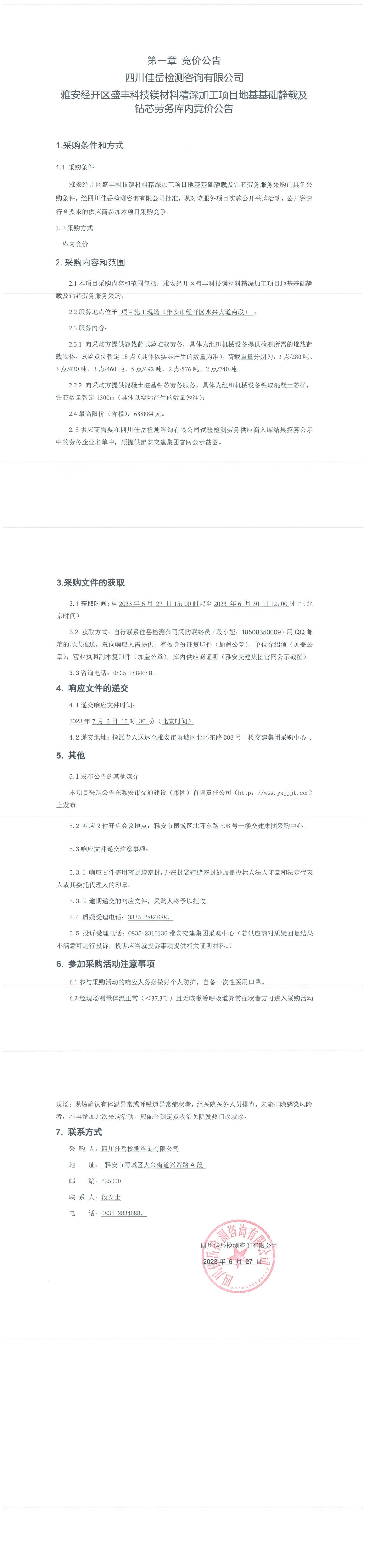 四川佳岳檢測咨詢有限公司雅安經開區(qū)盛豐科技鎂材料精深加工項目地基基礎靜載及鉆芯勞務庫內競價公告