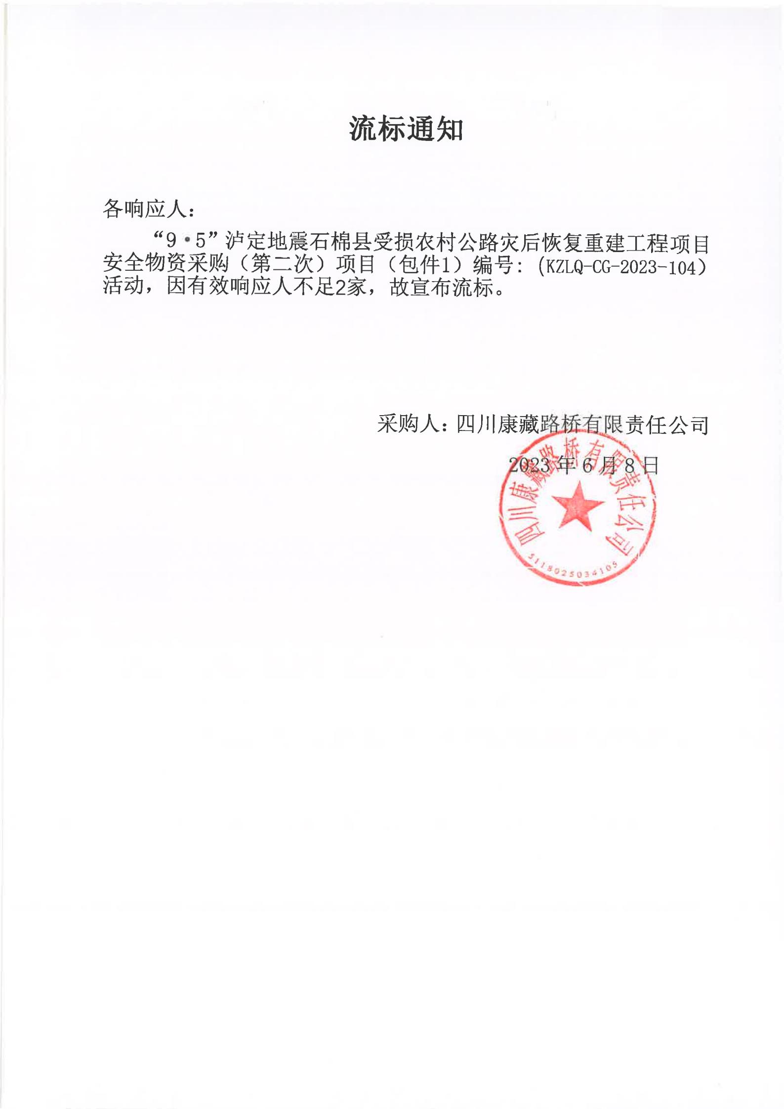 四川康藏路橋有限責(zé)任公司“9·5”瀘定地震石棉縣受損農(nóng)村公路災(zāi)后恢復(fù)重建工程項(xiàng)目安全物資競(jìng)價(jià)采購(gòu)(第二次)流標(biāo)通知