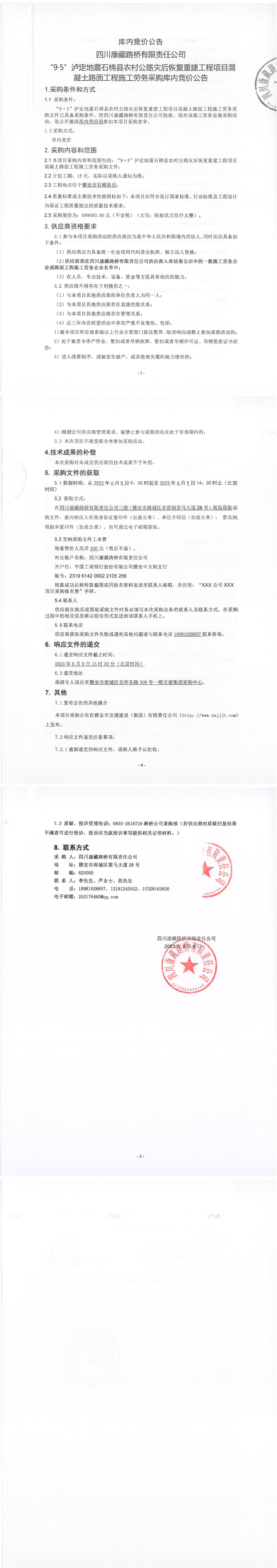 四川康藏路橋有限責(zé)任公司“9·5”瀘定地震石棉縣農(nóng)村公路災(zāi)后恢復(fù)重建工程項(xiàng)目混凝土路面工程施工勞務(wù)采購庫內(nèi)競(jìng)價(jià)公告
