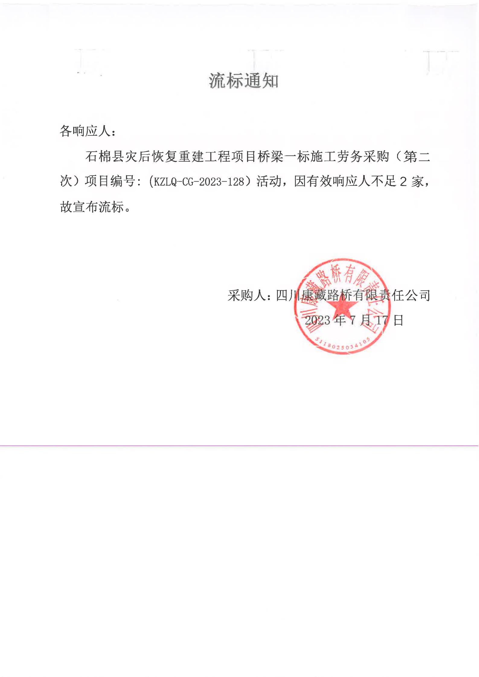 四川康藏路橋有限責(zé)任公司石棉縣災(zāi)后恢復(fù)重建工程項(xiàng)目橋梁一標(biāo)段施工勞務(wù)采購(gòu)(第二次)流標(biāo)通知