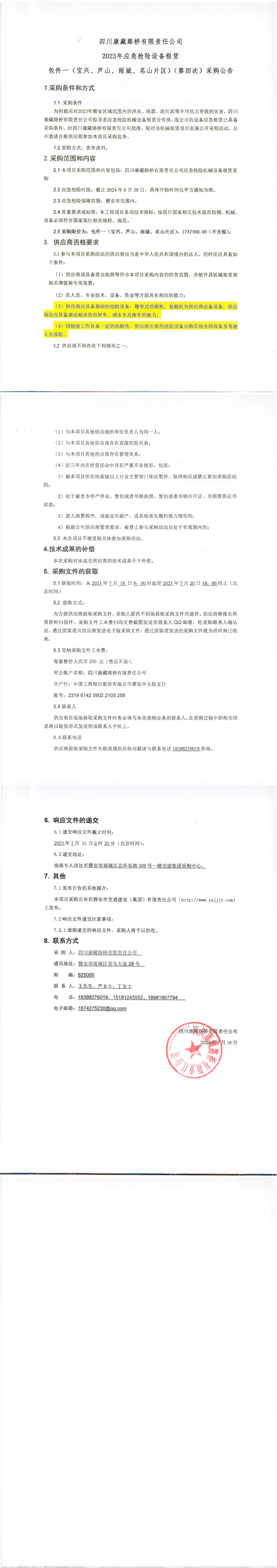 四川康藏路橋有限責任公司2023年應(yīng)急搶險設(shè)備租賃包件一(寶興、蘆山、雨城、名山片區(qū))(第四次)采購公告