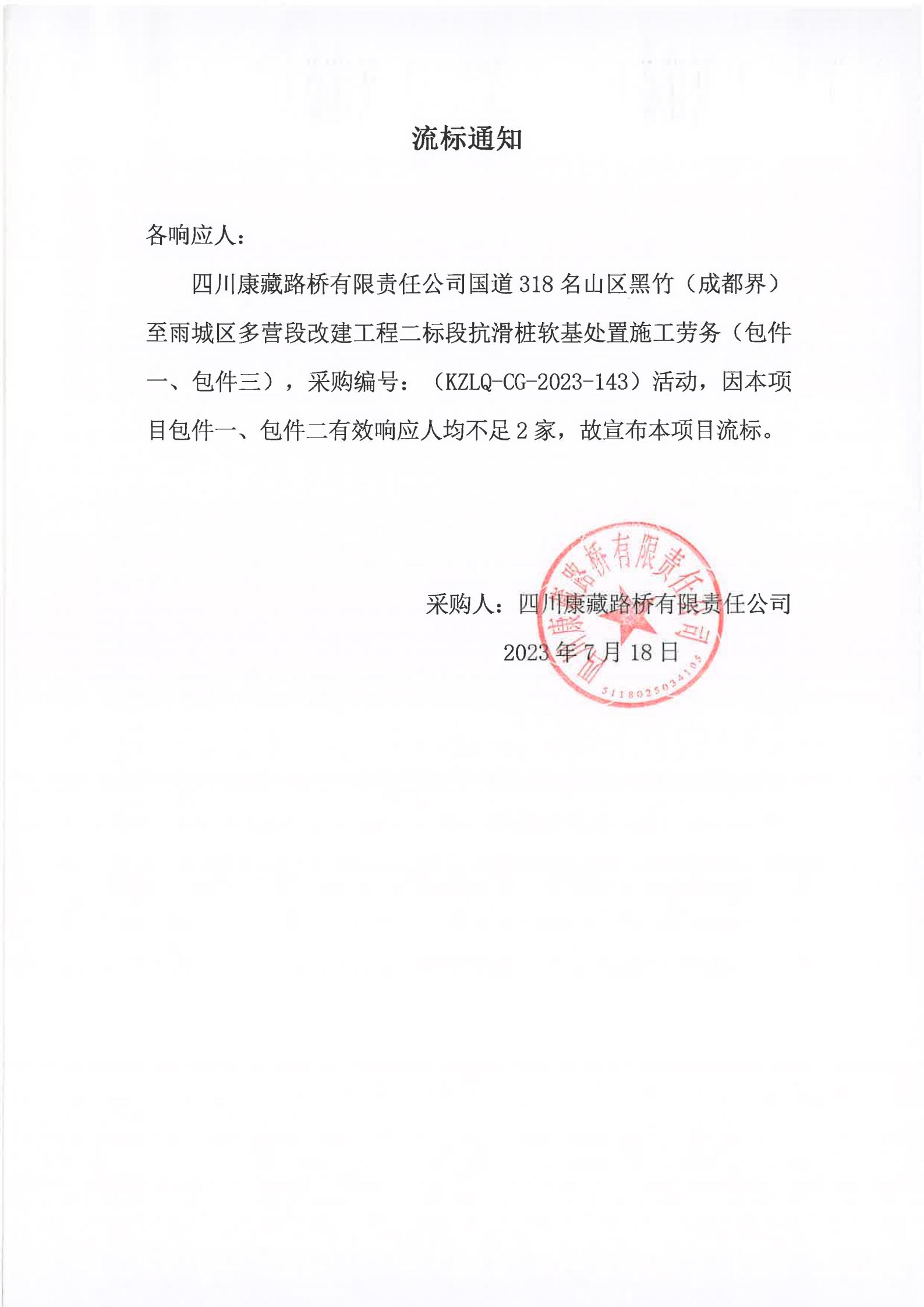 四川康藏路橋有限責(zé)任公司國道318名山區(qū)黑竹(成都界)至雨城區(qū)多營段改建工程二標(biāo)段抗滑樁軟基處置施工勞務(wù)(包件一、包件三)流標(biāo)通知