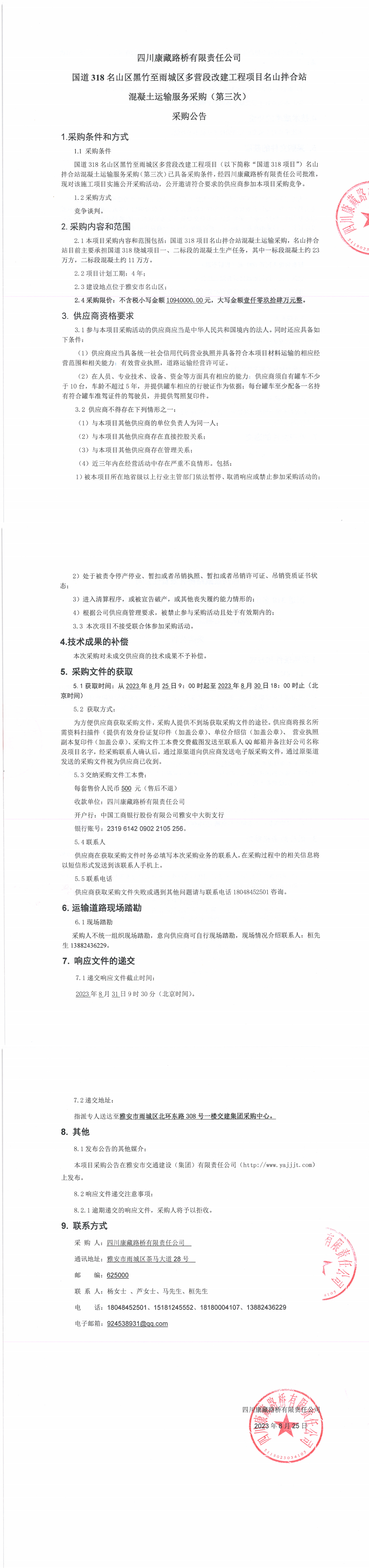 四川康藏路橋有限責(zé)任公司國道318名山區(qū)黑竹至雨城區(qū)多營段改建工程項(xiàng)目名山拌合站混凝土運(yùn)輸服務(wù)采購(第三次)采購公告