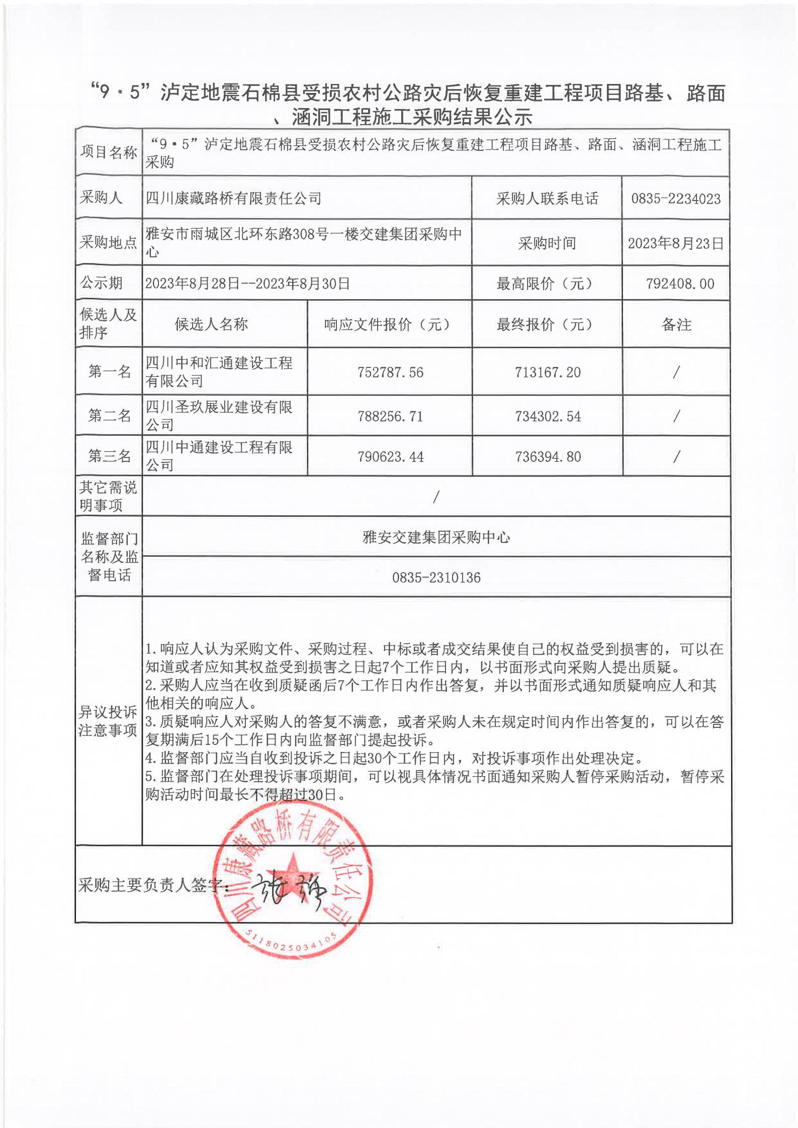 四川康藏路橋有限責(zé)任公司“9·5”瀘定地震石棉縣受損農(nóng)村公路災(zāi)后恢復(fù)重建工程項目路基、路面、涵洞工程施工采購結(jié)果公示
