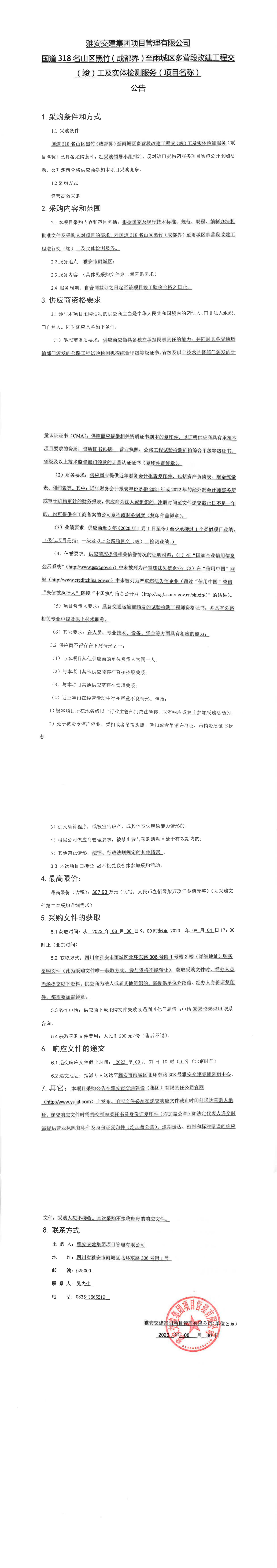 雅安交建集團(tuán)項(xiàng)目管理有限公司國道318名山區(qū)黑竹(成都界)至雨城區(qū)多營段改建工程交(竣)工及實(shí)體檢測服務(wù)(項(xiàng)目名稱)采購公告