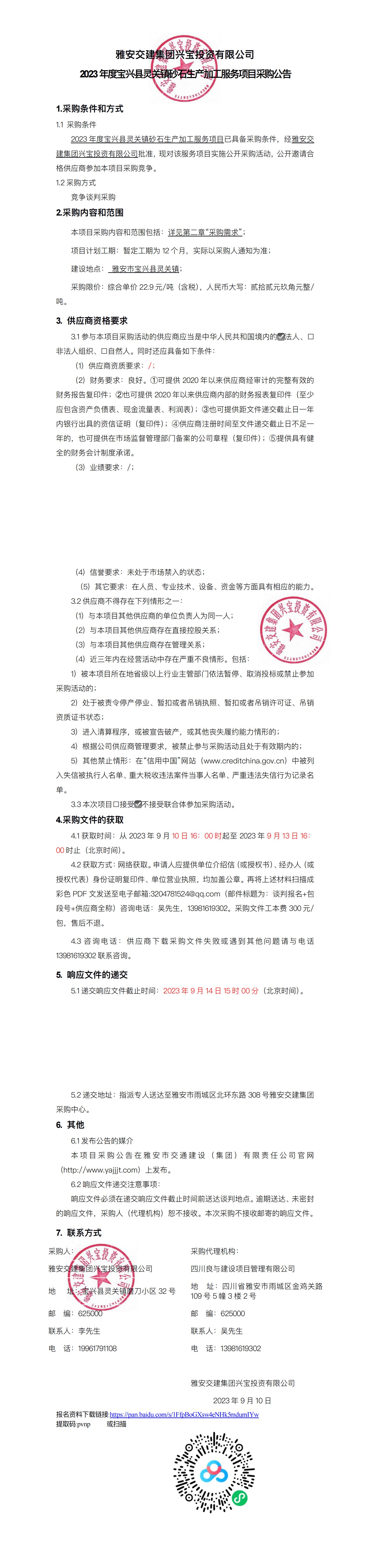 雅安交建集團(tuán)興寶投資有限公司2023年度寶興縣靈關(guān)鎮(zhèn)砂石生產(chǎn)加工服務(wù)項(xiàng)目采購公告