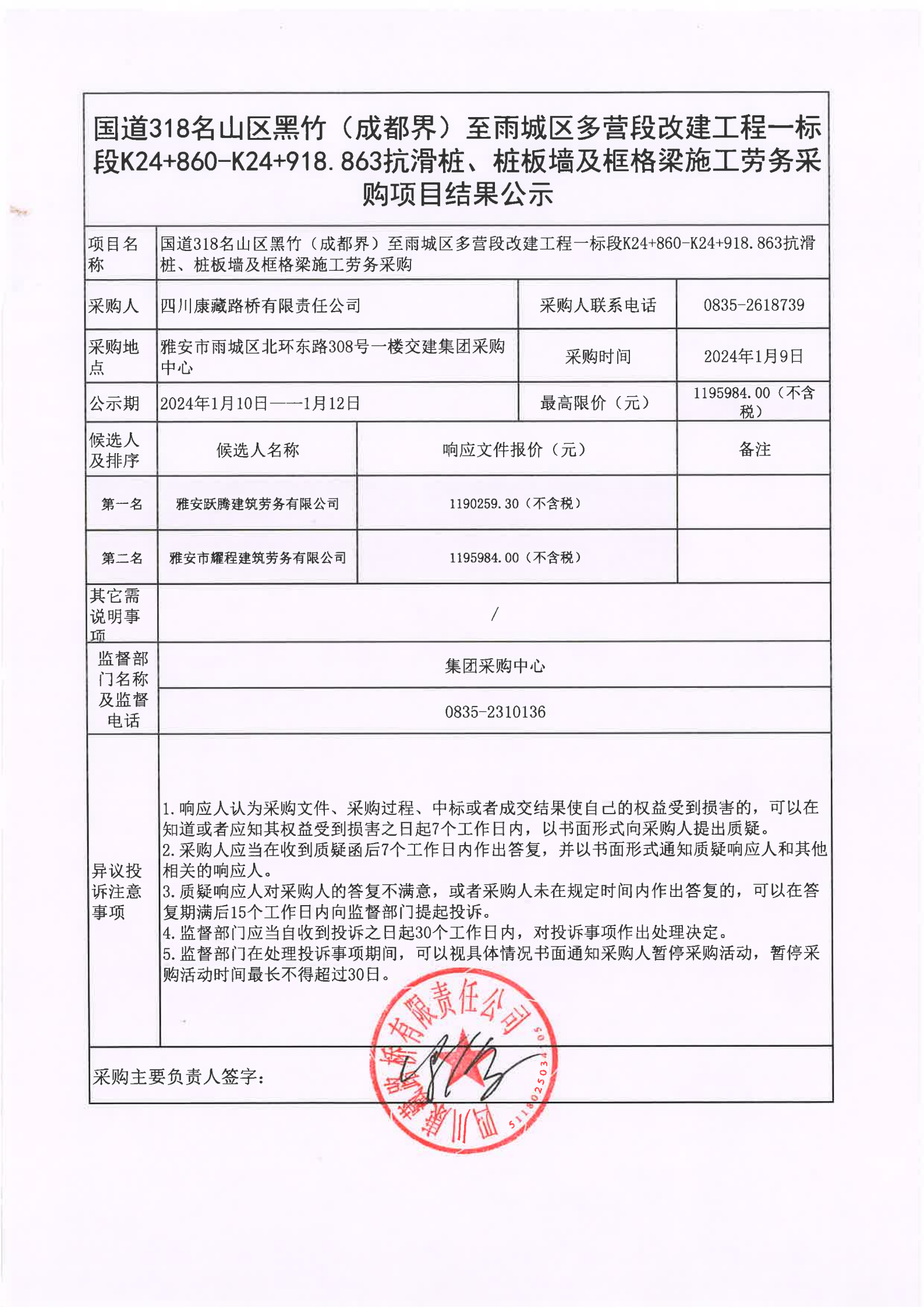 四川康藏路橋有限責(zé)任公司國道318名山區(qū)黑竹(成都界)至雨城區(qū)多營段改建工程一標(biāo)段K24+860-K24+918.863抗滑樁、樁板墻及框格梁施工勞務(wù)采購項(xiàng)目結(jié)果公示