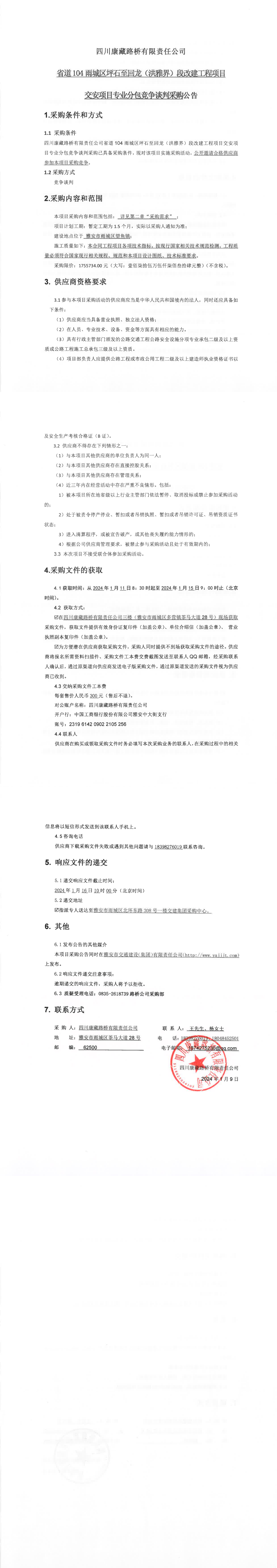 四川康藏路橋有限責(zé)任公司省道104雨城區(qū)坪石至回龍(洪雅界)段改建工程項目交安項目專業(yè)分包競爭談判采購公告