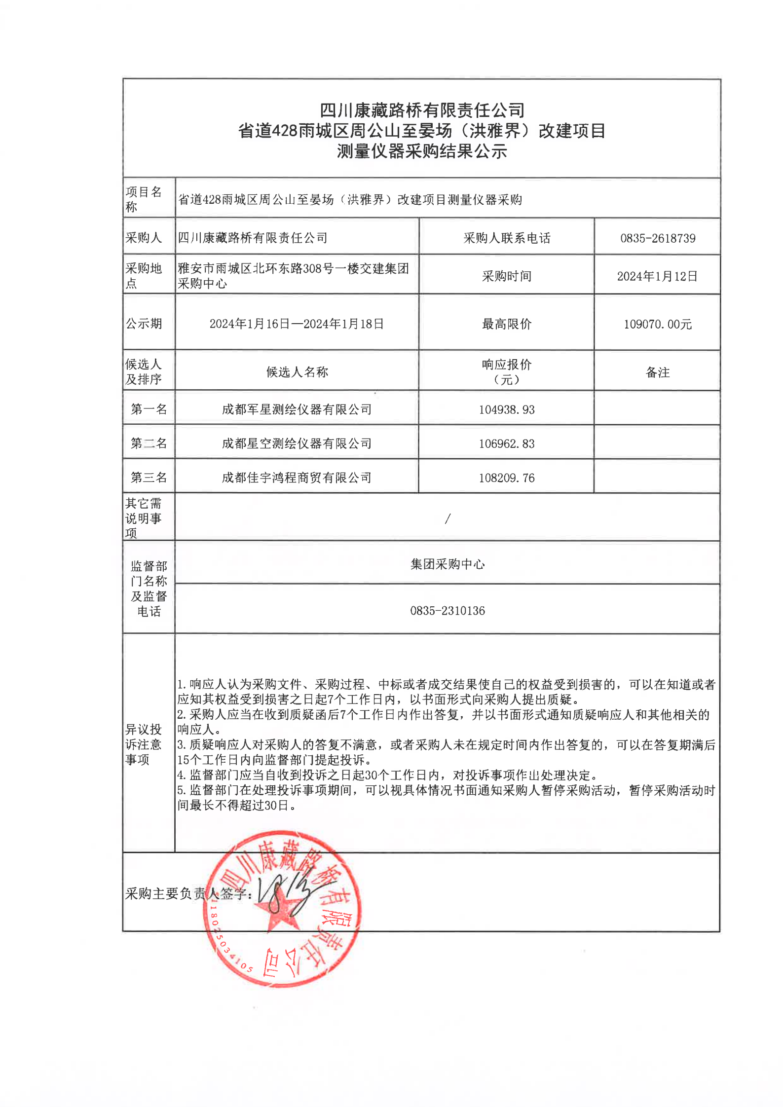 四川康藏路橋有限責(zé)任公省道428雨城區(qū)周公山至晏場(洪雅界)改建項目測量儀器采購結(jié)果公示