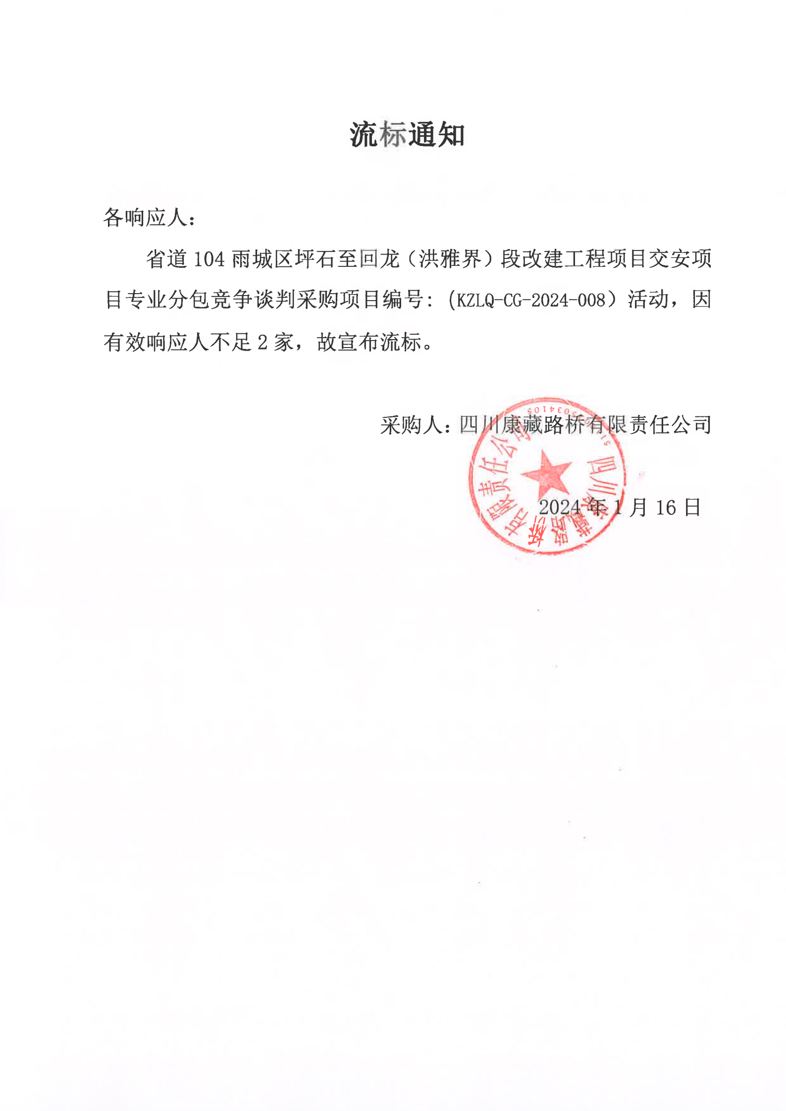四川康藏路橋有限責任公司省道104雨城區(qū)坪石至回龍(洪雅界)段改建工程項目交安項目專業(yè)分包競爭談判采購流標通知