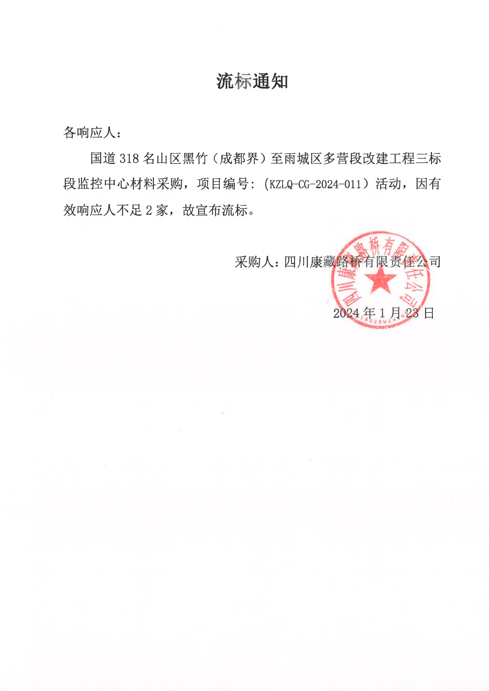 四川康藏路橋有限責任公司國道318名山區(qū)黑竹(成都界)至雨城區(qū)多營段改建工程三標段監(jiān)控中心材料采購流標通知