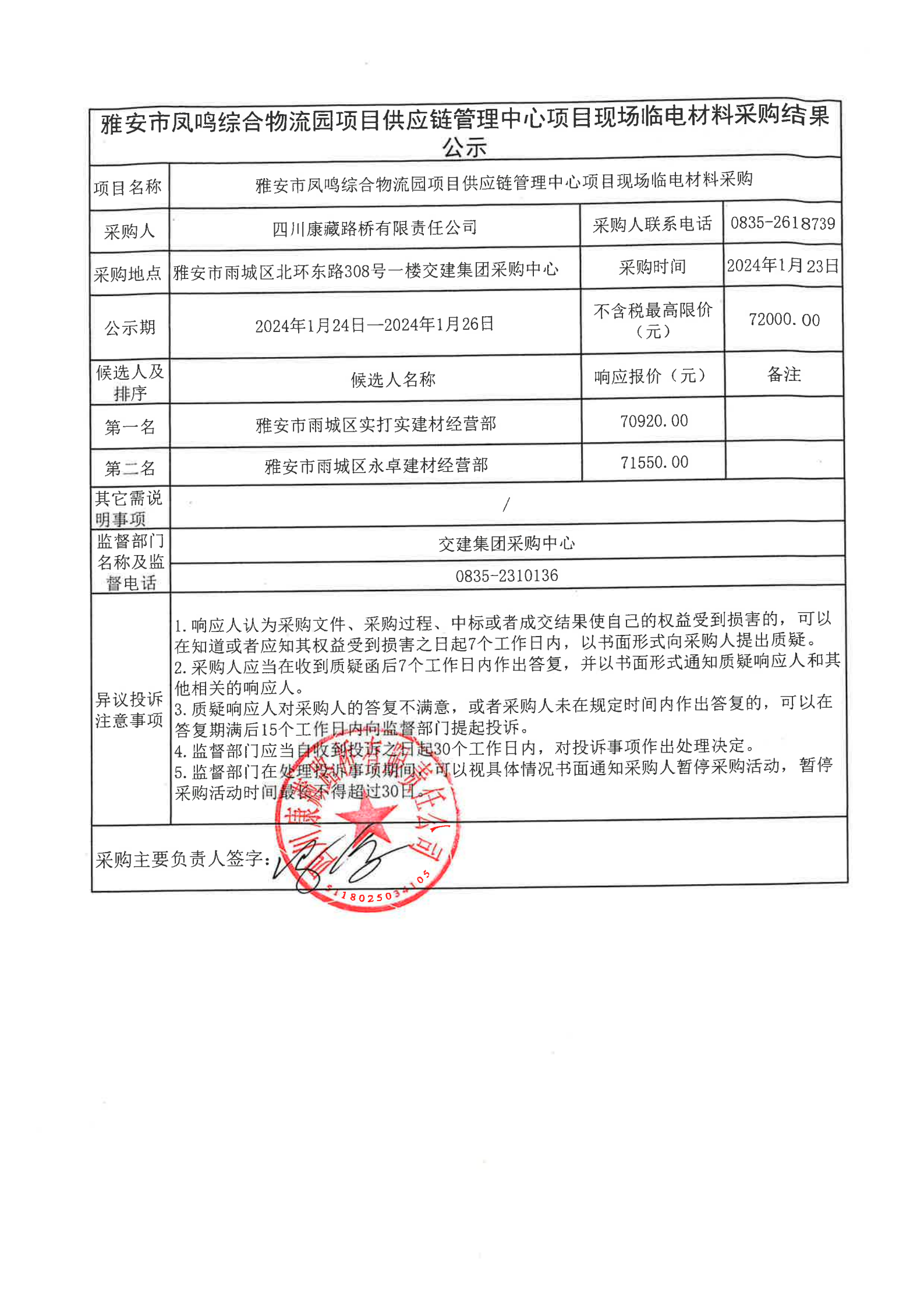 四川康藏路橋有限責任公司雅安市鳳鳴綜合物流園項目供應鏈管理中心項目現(xiàn)場臨電材料采購結(jié)果公示