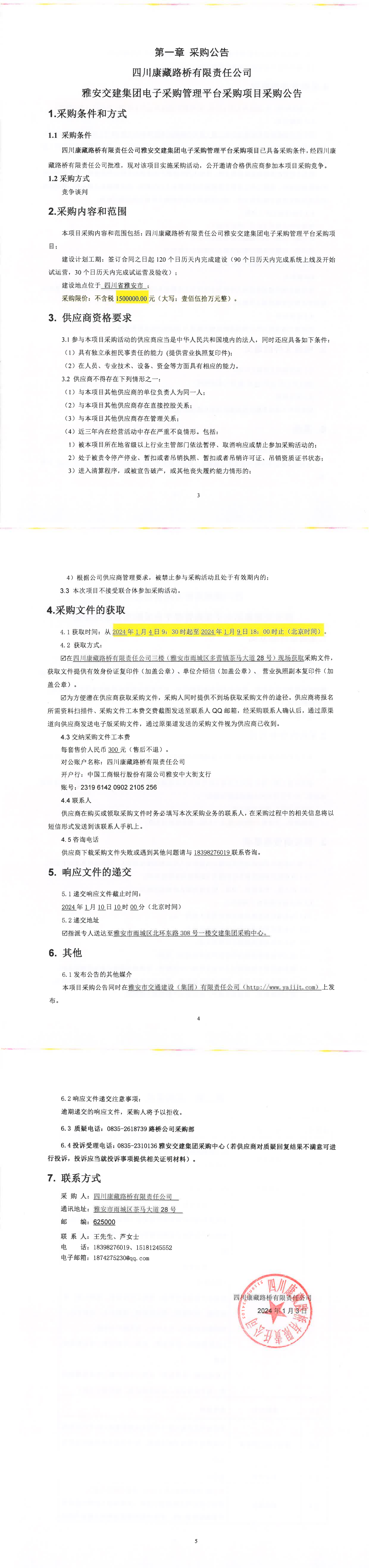 四川康藏路橋有限責(zé)任公司雅安交建集團(tuán)電子采購管理平臺采購項(xiàng)目采購公告
