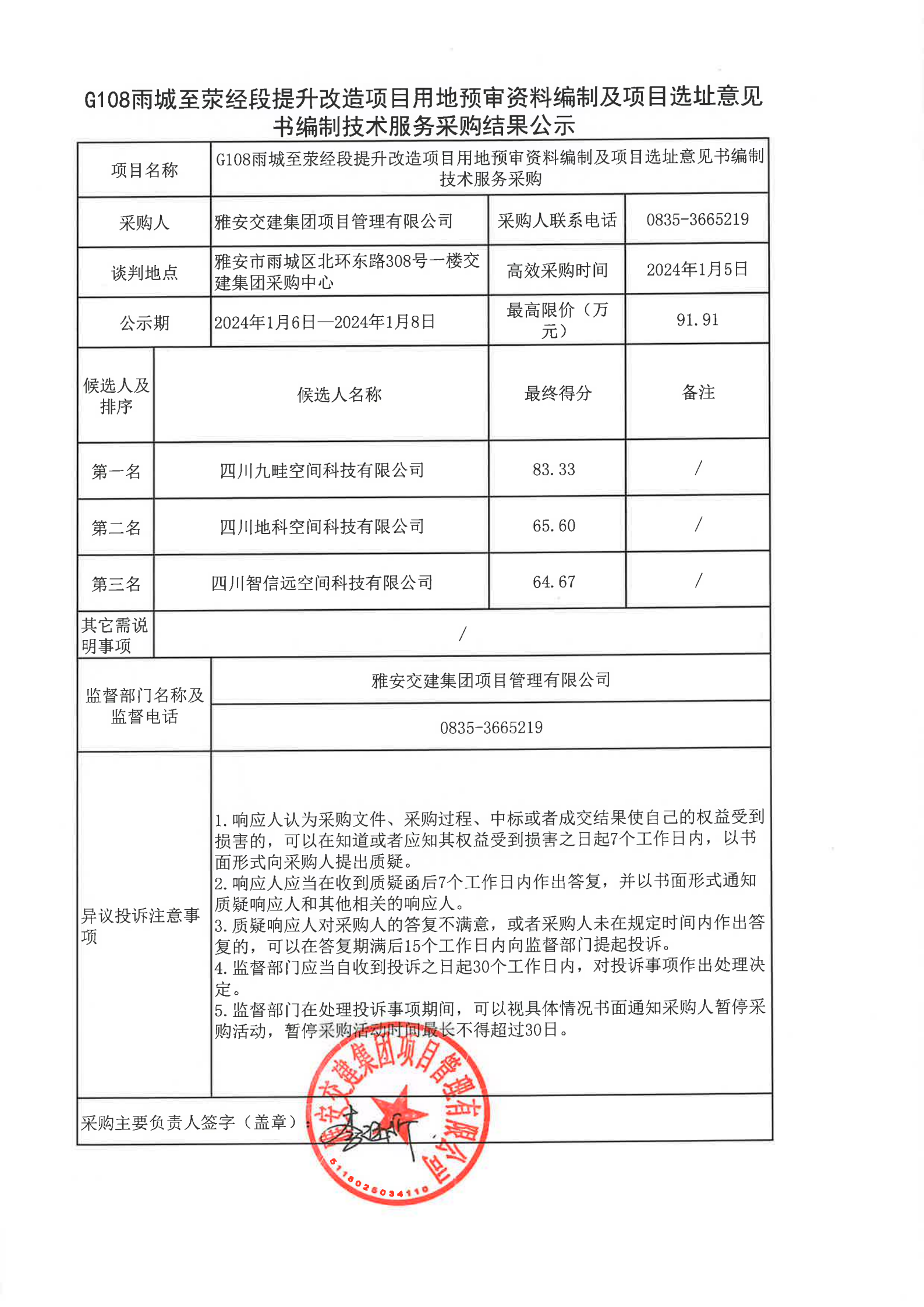 雅安交建集團(tuán)項目管理有限公司G108雨城至滎經(jīng)段提升改造項目用地預(yù)審資料編制及項目選址意見書編制技術(shù)服務(wù)采購結(jié)果公示