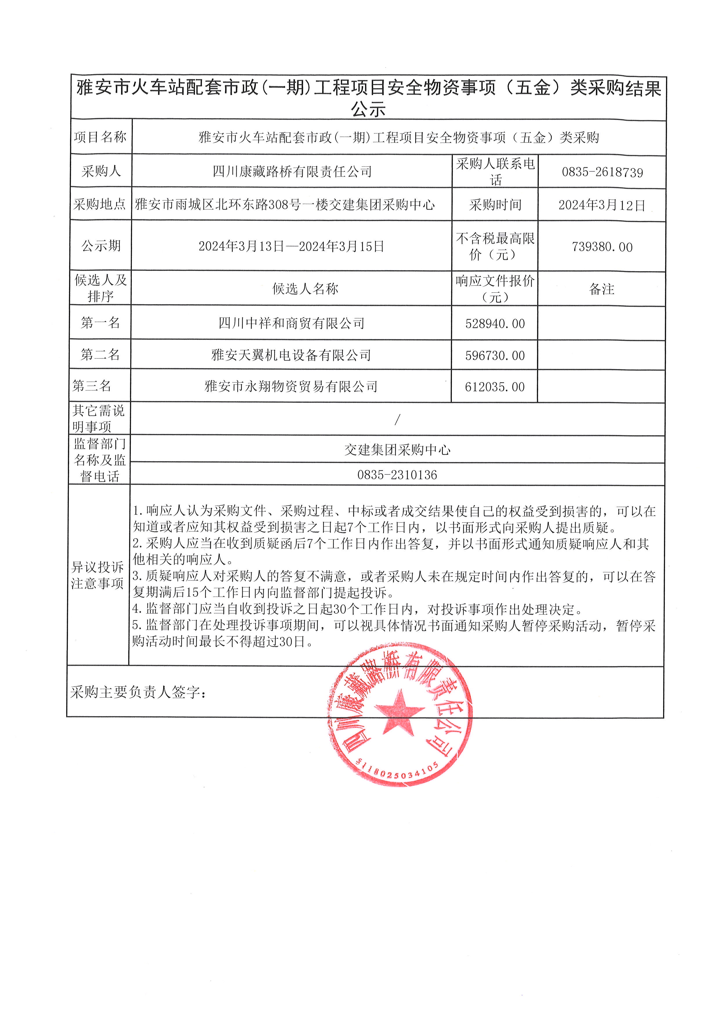 四川康藏路橋有限責(zé)任公司雅安市火車站配套市政(一期)工程項目安全物資(五金)采購結(jié)果公示