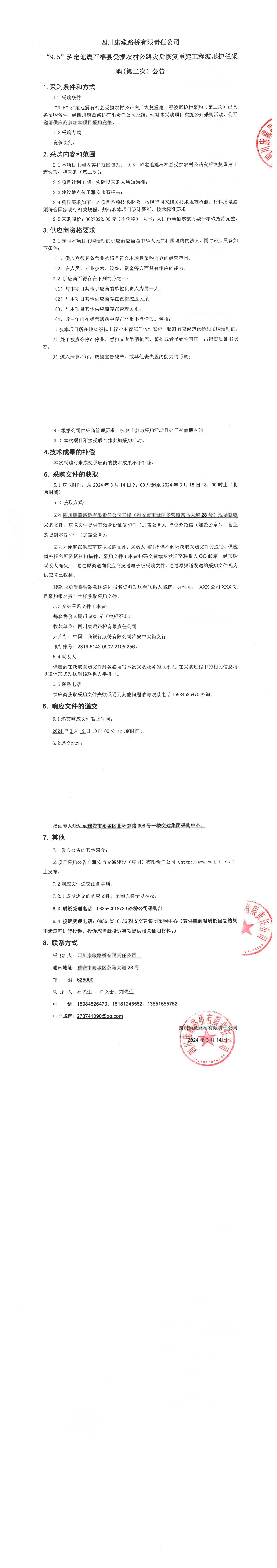 四川康藏路橋有限責任公司“9.5”瀘定地震石棉縣受損農(nóng)村公路災后恢復重建工程波形護欄采購(第二次)公告