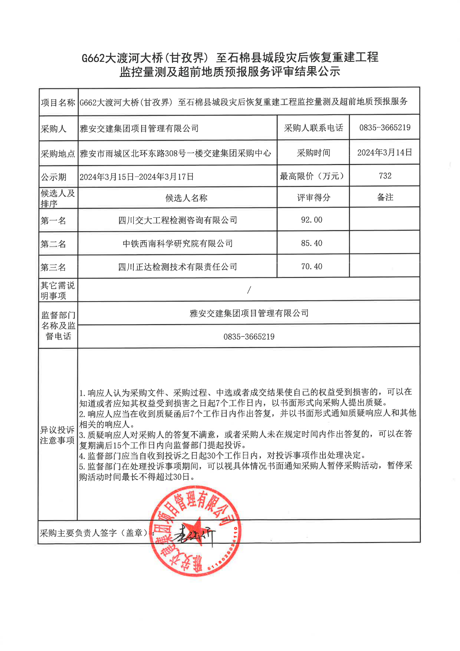 雅安交建集團(tuán)項(xiàng)目管理有限公司G662大渡河大橋(甘孜界)至石棉縣城段災(zāi)后恢復(fù)重建工程監(jiān)控量測及超前地質(zhì)預(yù)報(bào)服務(wù)評審結(jié)果公示