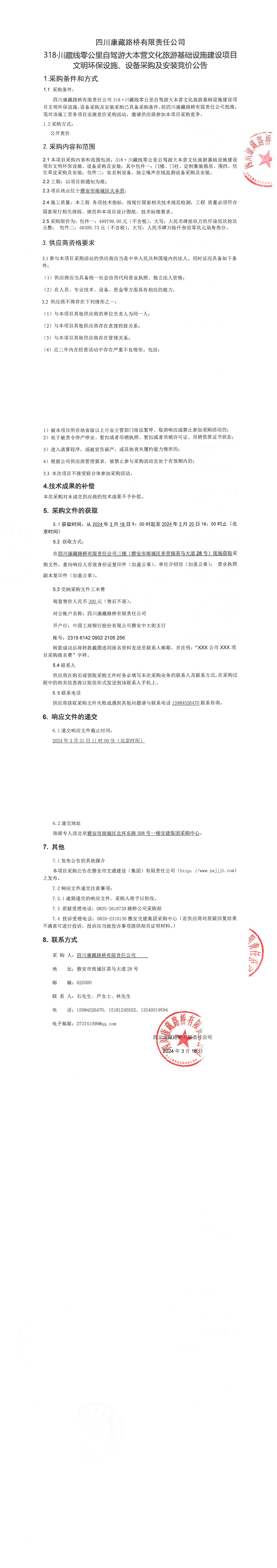 四川康藏路橋有限責(zé)任公司318·川藏公路零公里自駕游大本營文化旅游基礎(chǔ)設(shè)施建設(shè)項(xiàng)目文明環(huán)保設(shè)施、設(shè)備采購及安裝競(jìng)價(jià)公告