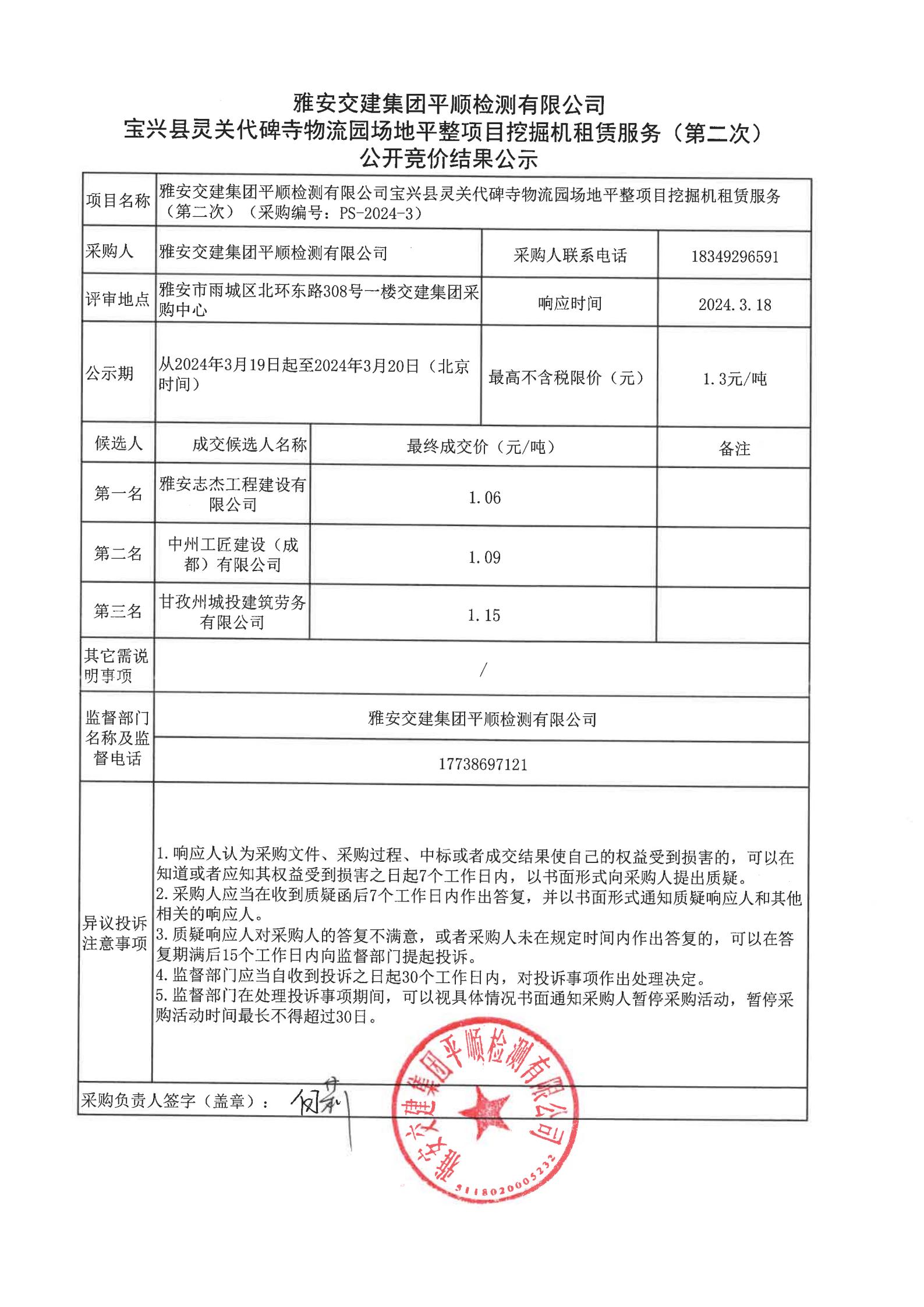 雅安交建集團平順檢測有限公司寶興縣靈關代碑寺物流園場地平整項目挖掘機租賃服務(第二次)競價結果公示