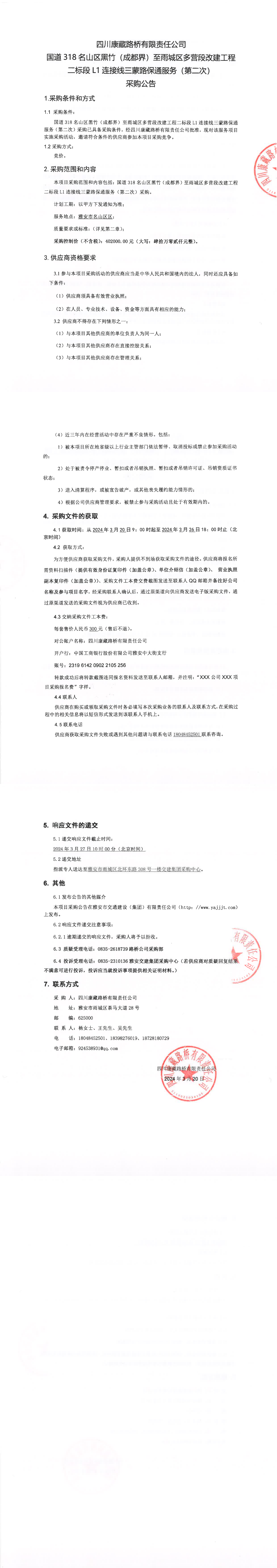 四川康藏路橋有限責任公司國道318名山區(qū)黑竹(成都界)至雨城區(qū)多營段改建工程二標段L1連接線三蒙路保通服務(第二次)采購公告