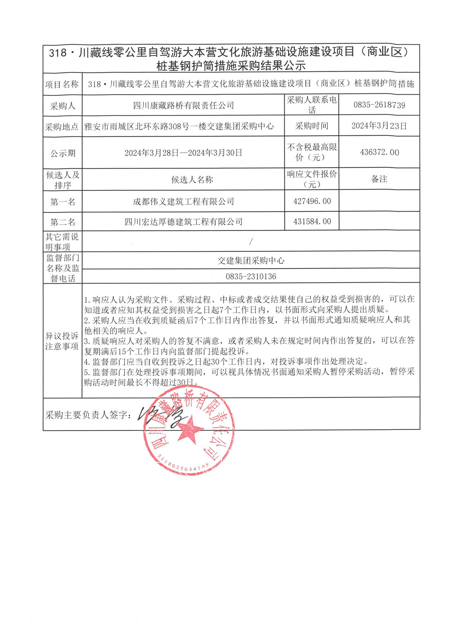 四川康藏路橋有限責(zé)任公司318·川藏公路零公里自駕游大本營文化旅游基礎(chǔ)設(shè)施建設(shè)項(xiàng)目(商業(yè)區(qū))樁基鋼護(hù)筒措施采購結(jié)果公示