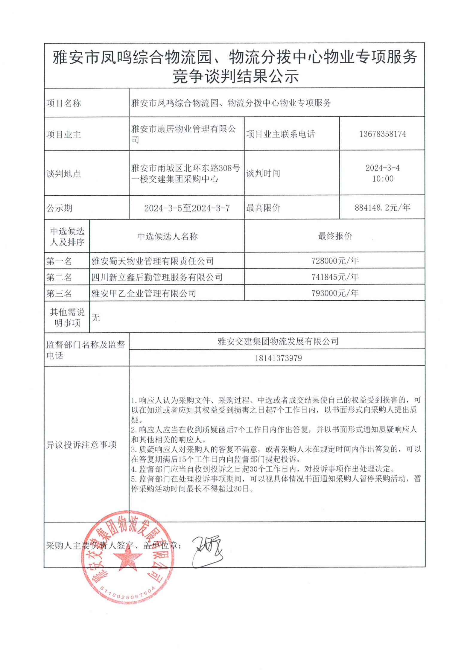 雅安市康居物業(yè)管理有限公司雅安市鳳鳴綜合物流園、物流分撥中心物業(yè)專項服務(wù)競爭談判結(jié)果公示