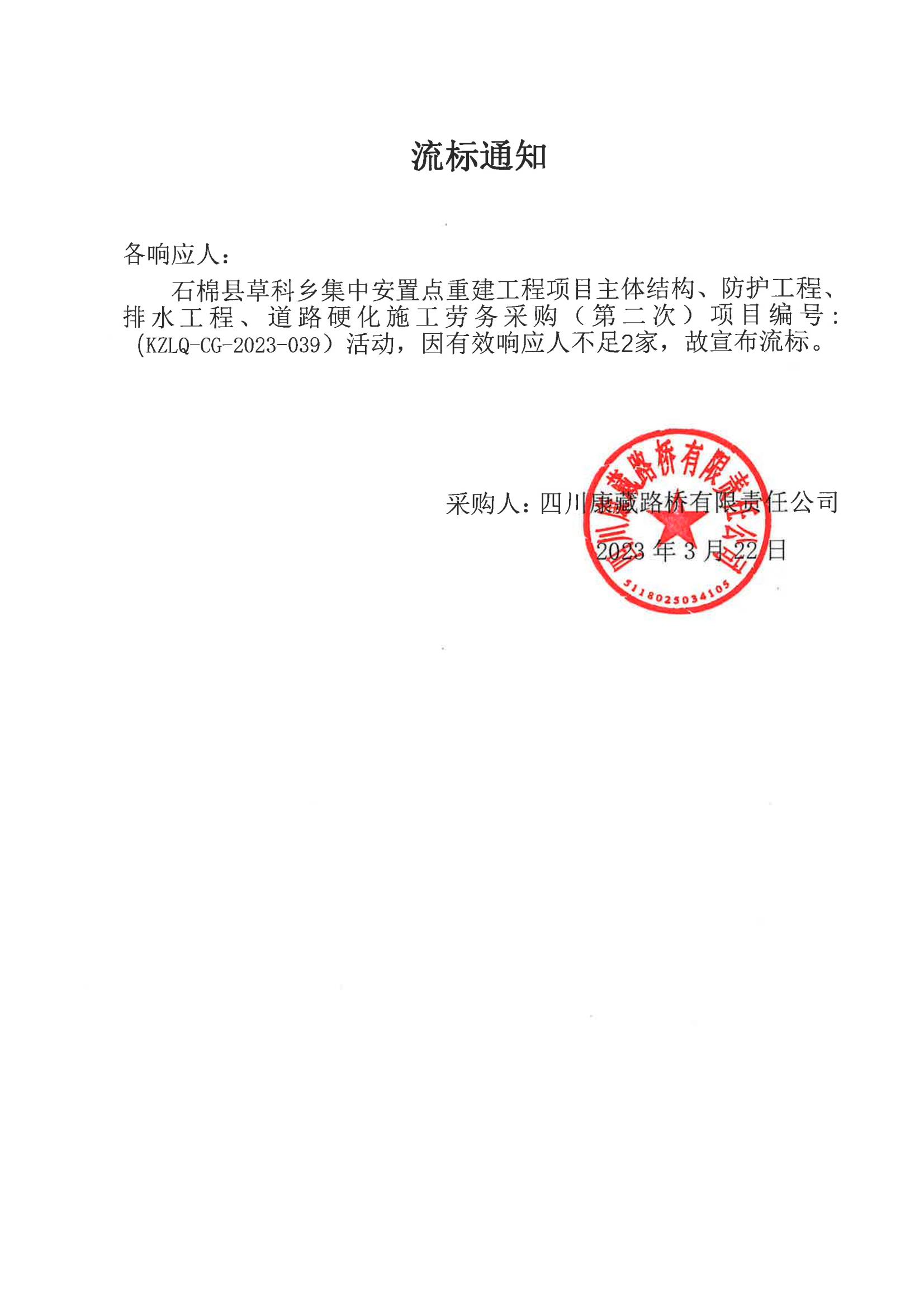 四川康藏路橋有限責(zé)任公司石棉草科鄉(xiāng)集中安置點重建工程項目主體結(jié)構(gòu)、防護(hù)工程、排水工程、道路硬化施工勞務(wù)采購流標(biāo)通知(第二次)