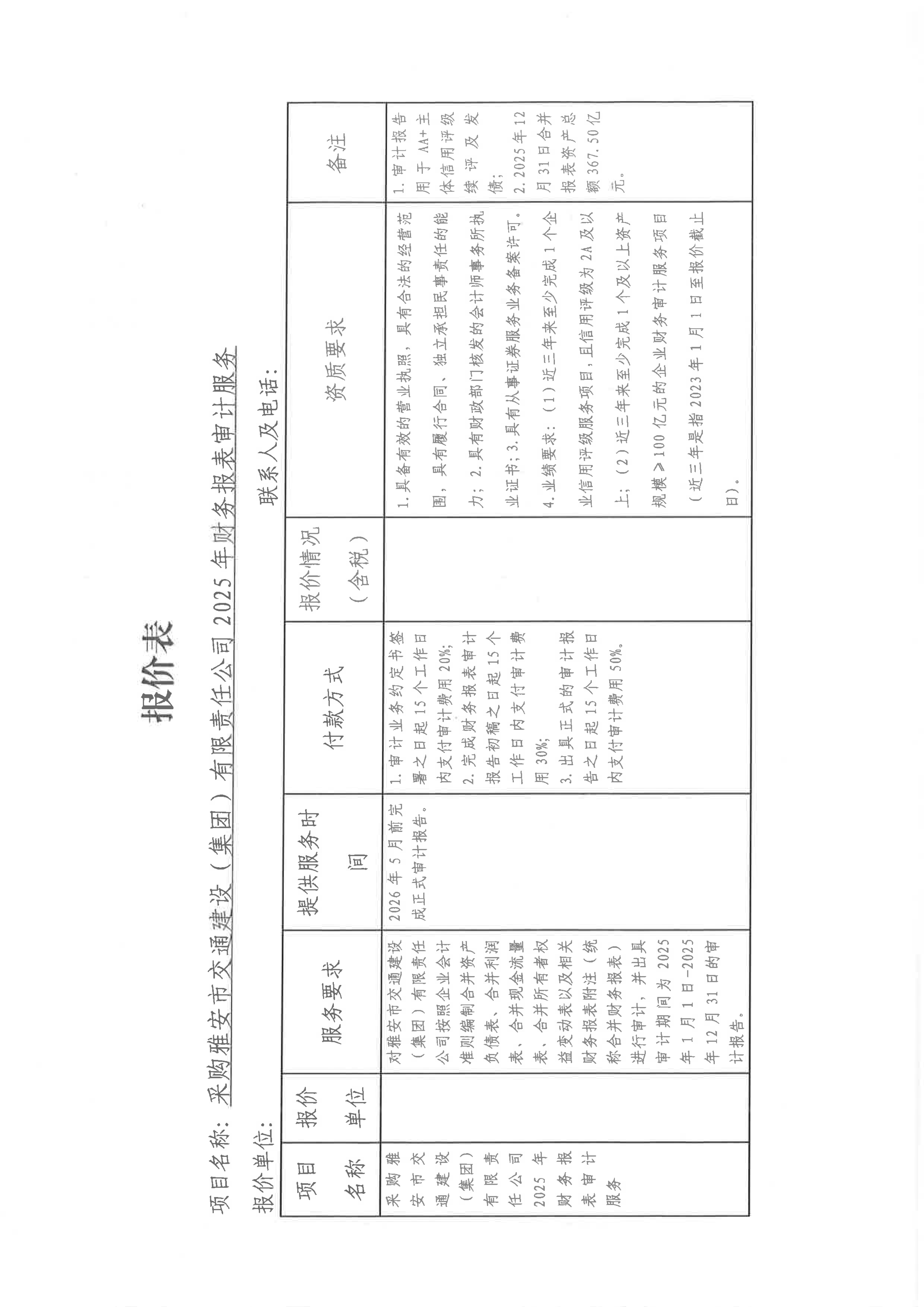 關(guān)于采購(gòu)雅安市交通建設(shè)(集團(tuán))有限責(zé)任公司主體信用評(píng)級(jí)2025年財(cái)務(wù)報(bào)表審計(jì)服務(wù)限價(jià)的詢價(jià)函