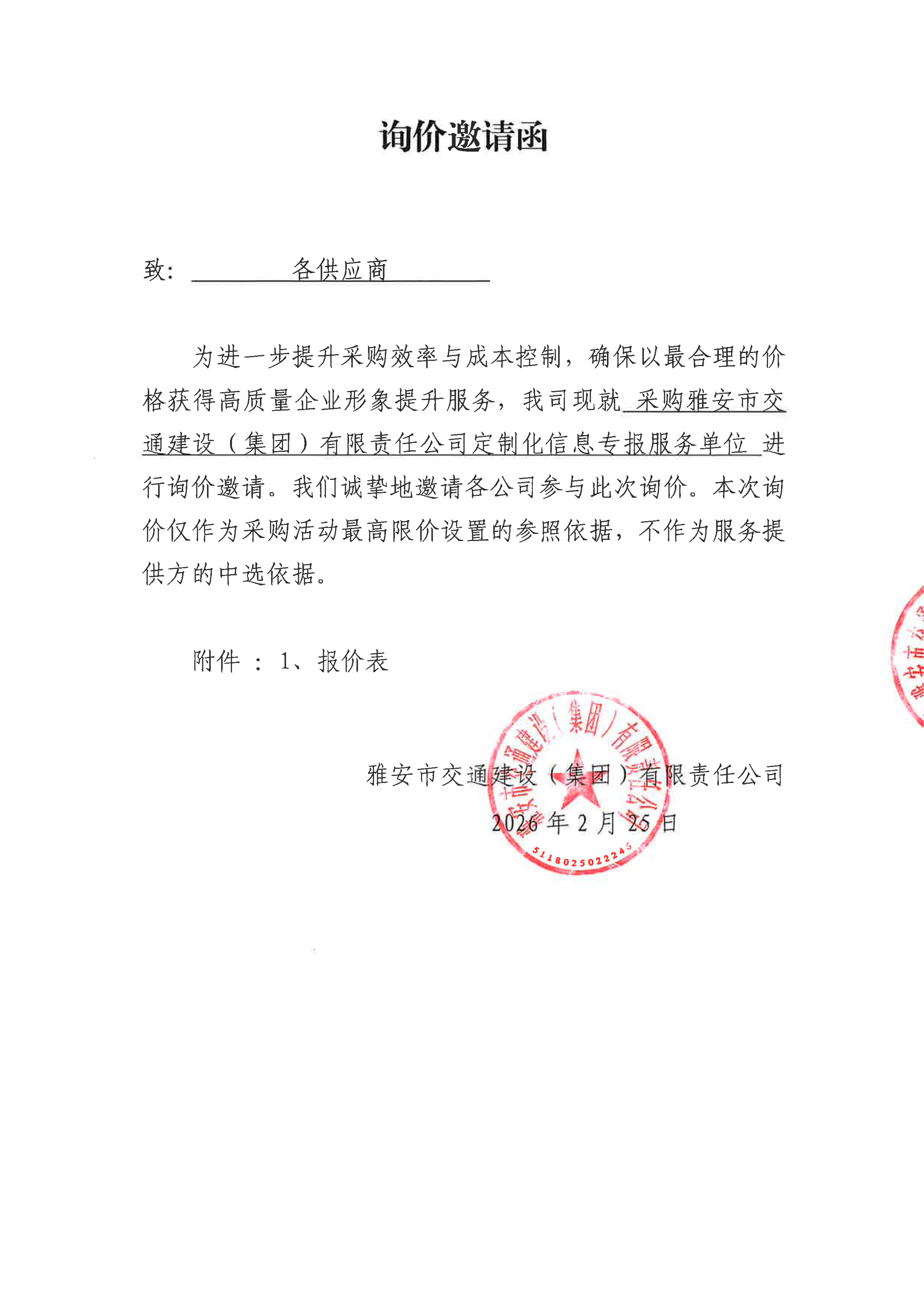 關(guān)于雅安市交通建設(shè)(集團(tuán))有限責(zé)任公司定制化信息專(zhuān)報(bào)服務(wù)采購(gòu)限價(jià)的詢(xún)價(jià)函