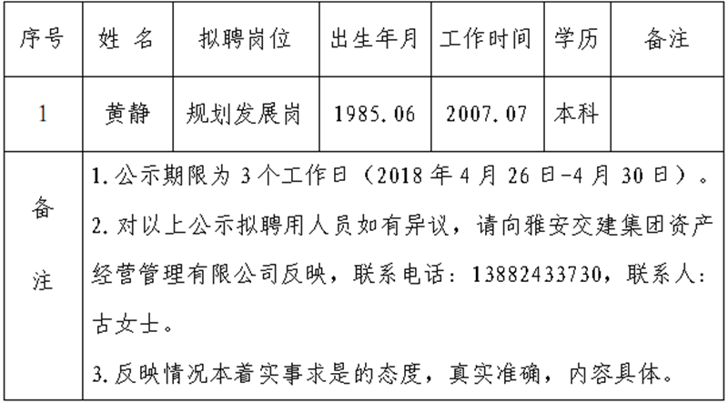 通過公開報名、資格審查、面試等程序,經雅安交建集團資產經營管理有限公司研究擇優(yōu)確定以下1名擬聘用人員,現公示名單如下: