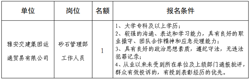 根據(jù)發(fā)展需要,決定面向社會公開招聘雅安市交通建設(shè)(集團(tuán))有限責(zé)任公司(以下簡稱“雅安交建集團(tuán)”)所屬子公司工作人員1名,現(xiàn)將有關(guān)事項(xiàng)公告如下: