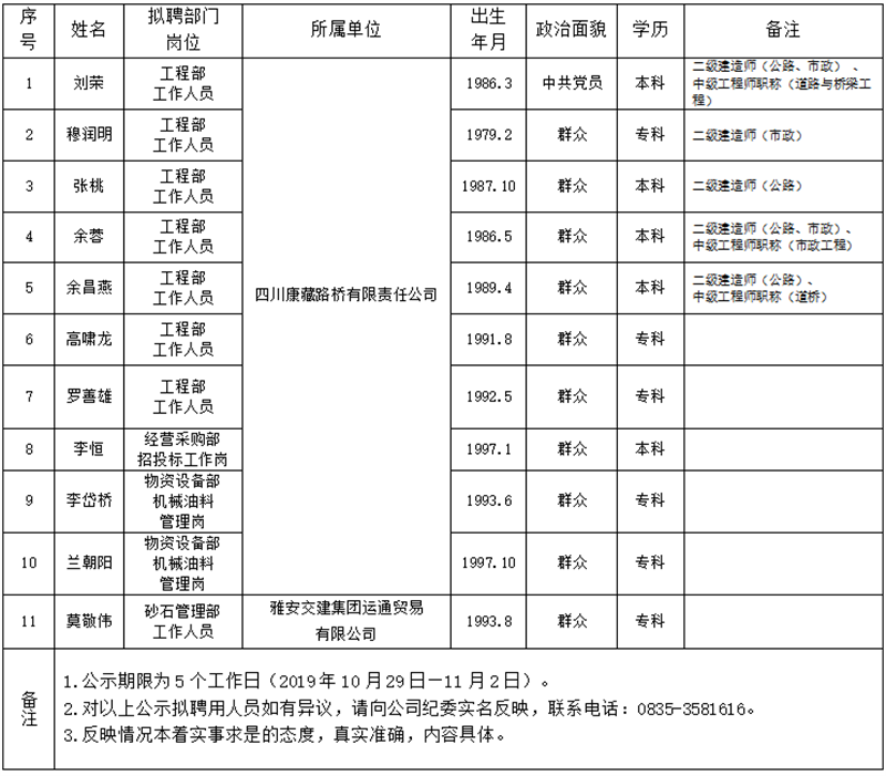 根據(jù)集團公司《人才選聘實施辦法》,通公告報名、資格審查、綜合測試各項招聘程序,現(xiàn)對以下擬聘用人員予以公示: