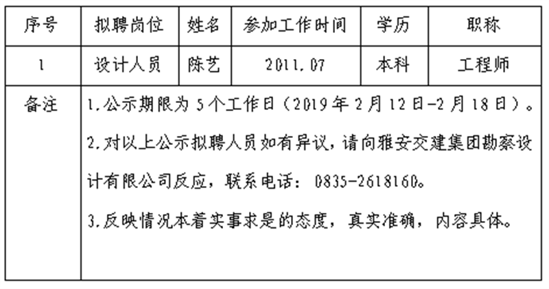 通過公開報(bào)名、資格審查、面試等程序,經(jīng)雅安交建集團(tuán)勘察設(shè)計(jì)有限公司研究,對以下1名擬聘用人員予以公示: