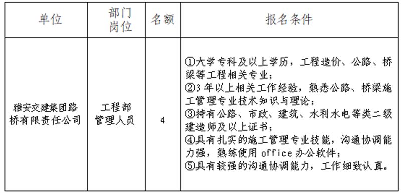 根據(jù)發(fā)展需要,決定面向社會(huì)公開(kāi)招聘雅安市交通建設(shè)(集團(tuán))有限責(zé)任公司(以下簡(jiǎn)稱“雅安交建集團(tuán)”)所屬子公司工作人員4名,現(xiàn)將有關(guān)事項(xiàng)公告如下: